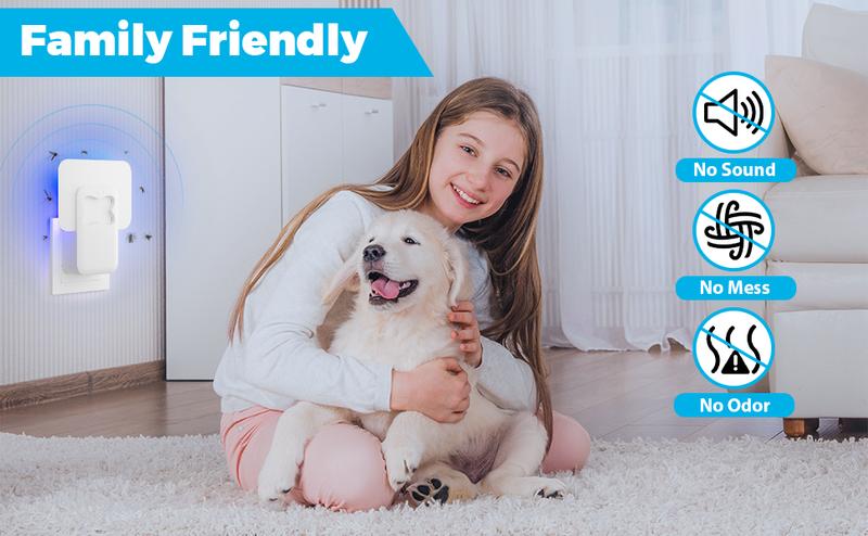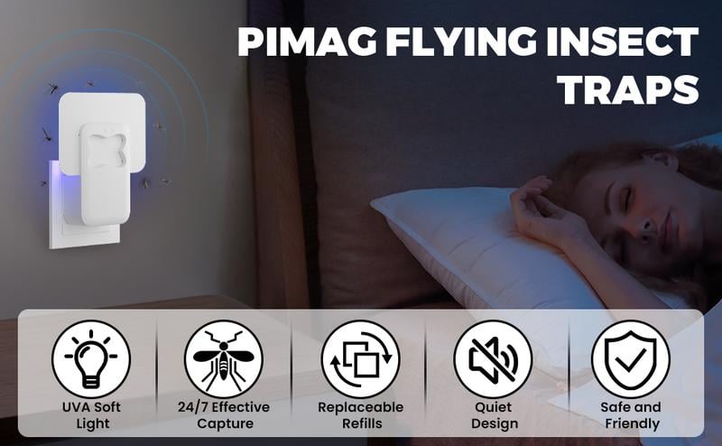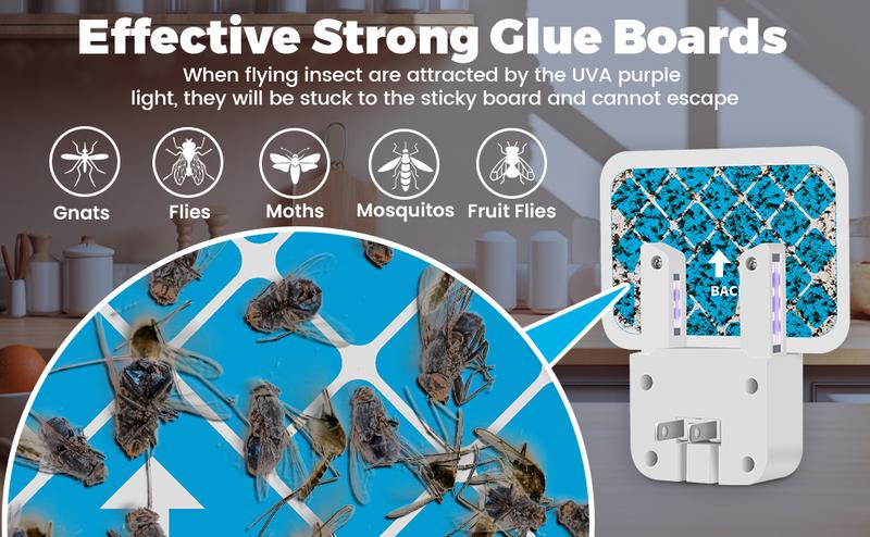 Simply plug it in and it will start working immediately, its low energy consumption ensures safe operation throughout the day. You can use the fly trap in a variety of places: bedrooms, kitchens, living rooms, farms, garages, indoor plant areas and more.·QUIET FLY TRAP: This fruit fly insecticide utilizes light to attract mosquitoes without making any sound. Create a quiet sleeping environment for you. The light is directed towards the wall, so you don't have to worry about the blue-violet light shining directly into your eyes.